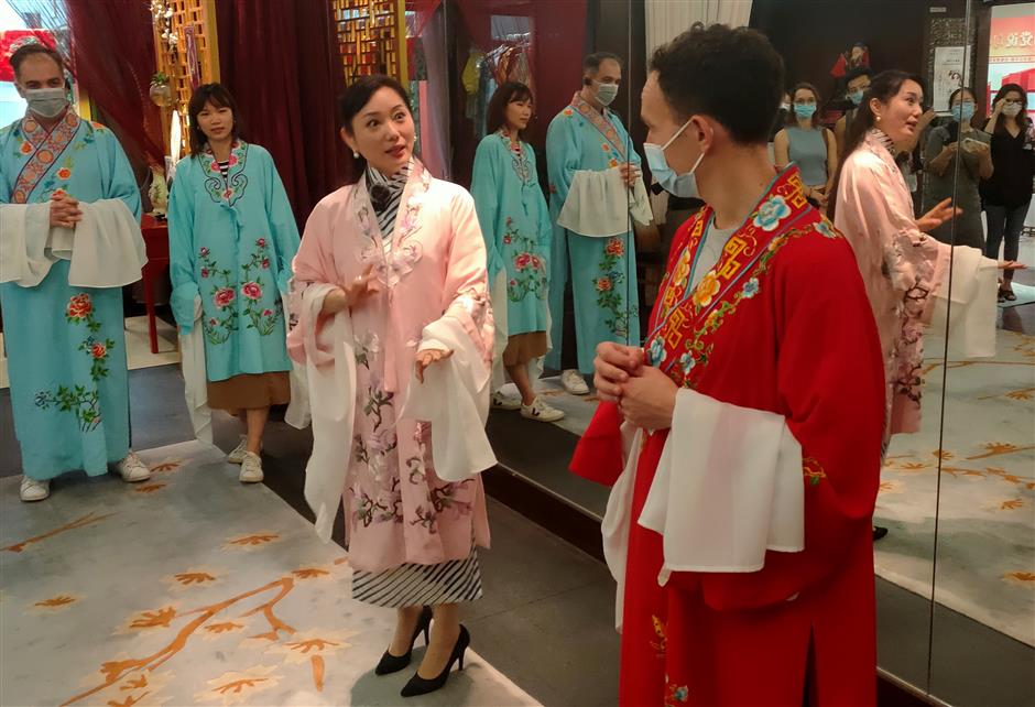 zhao jinyu (center) gives instruction of how to play water sleeves, a basic skill of kunqu opera, to visiting expats in gubei civic center.