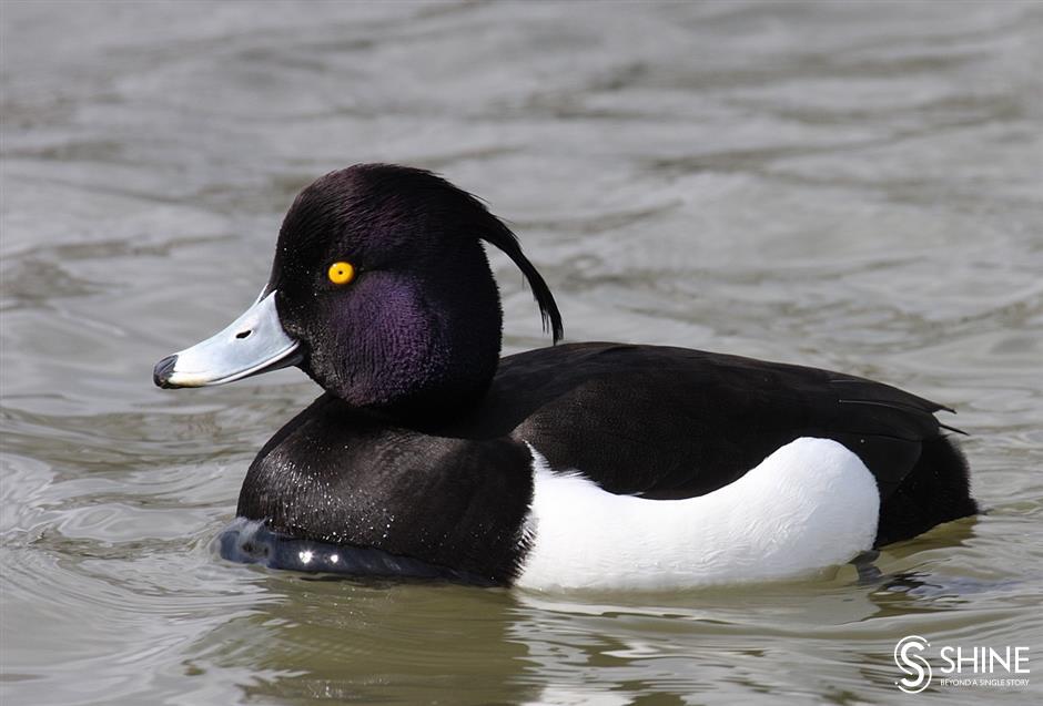 the females are duller, and the crests are less obvious. as indicated in their chinese name, this species can dive well. they can dive into the water for 2-3 meters and catch shrimp and other aquatic lives for food. compared with dabbling ducks, the diving ducks do not have obvious tail when floating on the water. their feet are positioned more to the back of the body, which gives them more push when diving in the water. however, this makes them very awkward when walking.