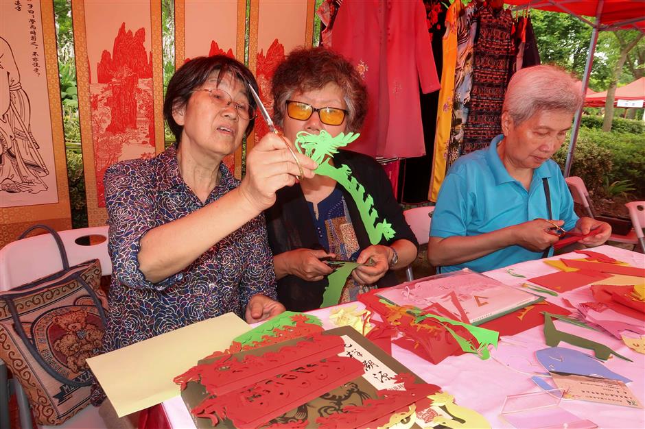 people try out paper-cutting in huangxing park in shanghai on june 16, 2018.