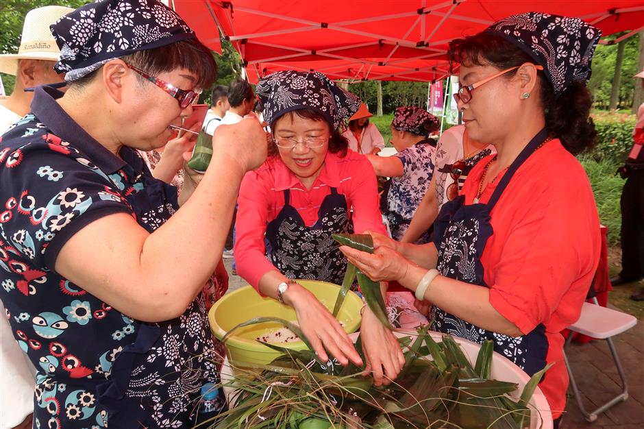 people make zongzi, or glutinous rice dumplings, a traditional food during the dragon boat festival, in huangxing park in shanghai on june 16, 2018.